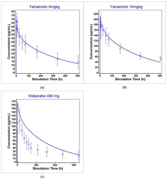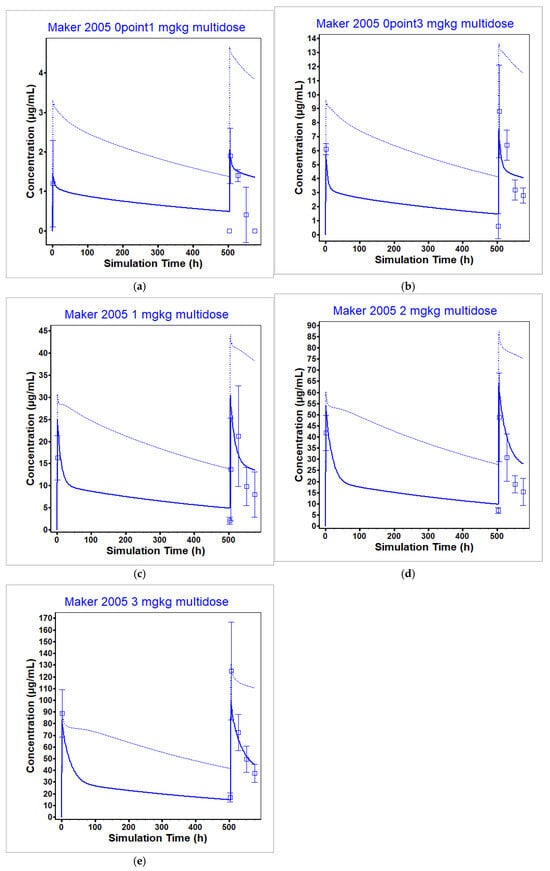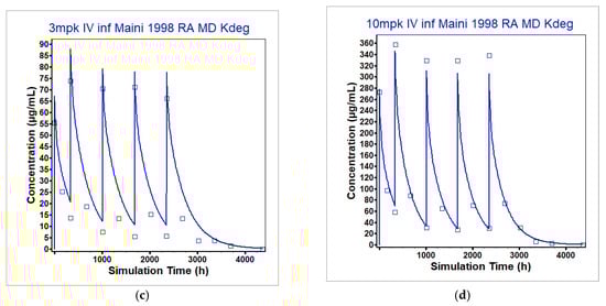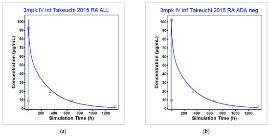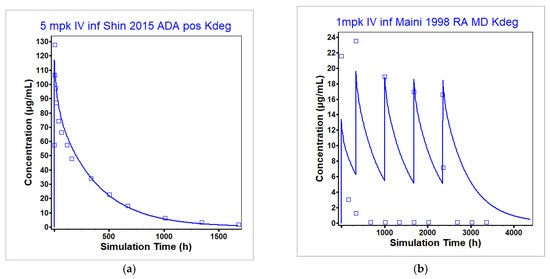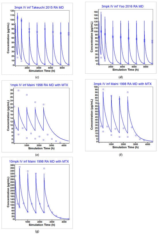 Once the model was optimized to healthy individuals, the model was then used for predictions in RA patients, as this is the patient population in which liver toxicity predictions will be made using the QST model BIOLOGXsym. The difference between healthy and RA patients in terms of the physiology in GastroPlus was an increase in TNF-α levels. Patients with inflammatory diseases such as RA are known to have higher TNF-α levels. Thilagar et al. [21] found that healthy patients have an average TNF-α concentration of 5.5 pg/mL, while RA patients can have an average concentration up to 30.5 pg/mL depending on the co-existence of other chronic conditions. RA patients in the GastroPlus model were characterized by this maximal increase in TNF-α levels. This change in TNF- α levels was sufficient to reproduce the observed data in RA patients without any other changes to the model optimized for NHV individuals. The model was validated against both single (Figure 4a,b) [45] and multidose administration of infliximab (Figure 4c–g) [45,46,47] in RA patients. Note that [46] contained multidose administration in RA patients with infliximab as a monotherapy and also in combination with methotrexate (MTX). Infliximab coadministered with MTX was chosen to validate the RA model for either ADA negative or non-reported ADA status as patients with monotherapy infliximab are more likely to develop ADAs [31] which can affect the PK of infliximab. Table 7 (rows 3 and 4) gives the simulated and observed PK parameters after single dose administration in RA patients. All simulated PK parameters fell within BE limits of the observed PK parameters after single dose administration in RA patients. For the multidose administrations, the plasma concentration time profiles were not characterized sufficiently to calculate the PK parameters. Overprediction of the Cmax can be observed in some instances; however, as this is an IV infusion, this is likely attributable to incomplete information about the modeled population related to blood volume and not a reflection of model misspecification. Discrepancies at dose levels below the clinical dosing level (Figure 4e) are most likely attributable to incorrect characterization of the saturation of binding to TNF-α. Since liver toxicity predictions will not be made using sub-clinical dosing protocols, the rationale for model misfit to this dose level was not explored.