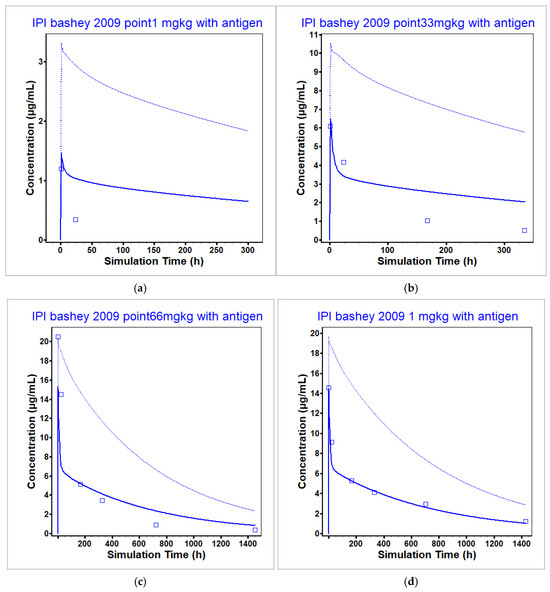 The ipilimumab PBPK model was optimized to a single dose of ipilimumab using both a 1 mg/kg and 3 mg/kg dose level from [9] in patients with relapse of malignancy after allogeneic hematopoietic cell transplantation, including patients with cancer and graft vs. host disease, and was validated across many dose levels both above and below the clinical dose level as well as via the use of multidose data in cancer patients. Note that all ipilimumab concentrations were measured using an ELISA that quantified concentrations by measuring binding to immobilized CTLA-4. Therefore, all measured concentrations are assumed to be unbound (not total) ipilimumab concentrations and were predicted as such within GastroPlus. In this case, unbound concentrations were different than total concentrations. The unbound concentrations were used to reproduce the observed data. The optimization and validation datasets are presented in Figure 6 and Figure 7. Figure 6 presents the model prediction under sub-clinical dose levels, while Figure 7 presents the model prediction under clinically relevant dose levels. Out of the seven datasets used for optimization (1 and 3 mg/kg from [9]) and validation (0.1, 0.33, and 0.66 mg/kg from [9] and 3 and 10 mg/kg from [49]), four had predicted Cmax within BE limits with a total range of 0.75- to 1.56-fold of the observed values, and two had predicted AUC within BE limits with a total range of 0.69- to 1.44-fold of the observed values.