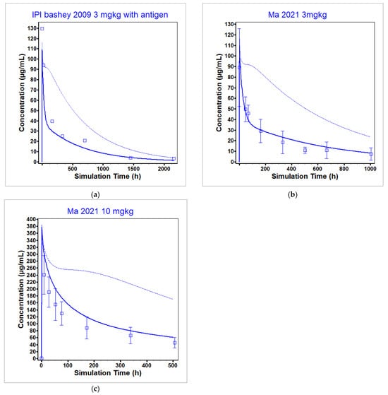 Three PBPK models for the monoclonal antibodies infliximab, ipilimumab, and nivolumab were optimized and validated using clinically observed plasma concentration time profiles across many different dose levels. The majority of the parameter values came from the literature, with only a few parameters optimized in each model. Each model incorporated a binding antigen (TNF-α in the case of infliximab, CTLA-4 in the case of ipilimumab, and PD-1 in the case of nivolumab). The PBPK model for infliximab was calibrated for predictions in both healthy and RA-specific patients, while those for ipilimumab and nivolumab were specific to non-healthy patients, as clinical PK data were only available in patient populations. In all three cases, the non-healthy patient population was characterized by increased levels of the drug’s target antigen compared to a typical range in a healthy individual. Patient variability in antigen concentration was not directly explored. However, simulations of an average individual exploring a range of physiological values for antigen concentrations did not show any difference in the predicted plasma concentration time profile in the case of infliximab and nivolumab (Figures S1 and S2 in the Supplementary Materials, respectively). Target antigen concentrations of CTLA-4 were shown to have an effect on the PK of ipilimumab. However, due to the lack of data in patient variation of CTLA-4, this was not explored in the model.