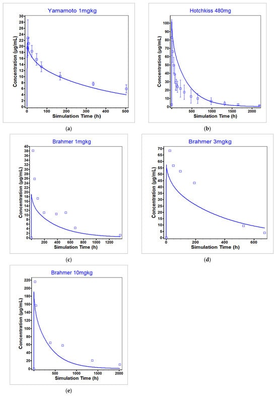 Validation datasets used for the nivolumab PBPK model at dose levels (a) 1 mg/kg [51], (b) 480 mg [54], (c) 1 mg/kg [53], (d) 3 mg/kg [53], and (e) 10 mg/kg [53]. The observed data are represented by the squares and the average model prediction is represented by the line.