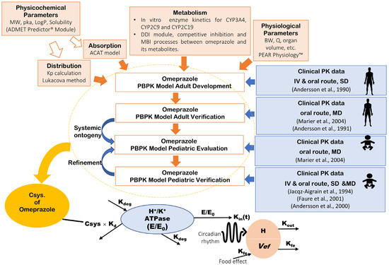 A whole-body PBPK model of omeprazole and its major metabolites (hydroxy-omeprazole and omeprazole sulphone) was built and evaluated using plasma profiles from clinical studies, as depicted in the workflow in Figure 1. The first step in developing the omeprazole PBPK model involved predicting drug-specific parameters using the ADMET PredictorTM Module based on the structure of the omeprazole compound. Concurrently, a comprehensive literature review was conducted to gather experimental physicochemical and biopharmaceutical parameters and all PK/clinical information on omeprazole. Human organ weights, volumes, and blood perfusion rates specific to subjects in each study (sex, age, and body weight) were generated using the GastroPlus® internal Population Estimates for Age-Related (PEAR) Physiology™ Module.