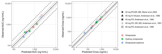 The physicochemical parameters were initially obtained from literature, and the physiology of the patients was informed from the respective source of data. The key input parameters used to build the PBPK models for omeprazole, hydroxy-omeprazole, and omeprazole sulphone are summarized in Table 2, Tables S2 and S3. The model successfully predicted both the shape and magnitude of the observed profiles for omeprazole and its metabolites, as reported by Andersson et al., 1990 [27], demonstrating that the distribution and metabolism processes were well established. Predicted versus observed plasma concentrations obtained after the IV administration of 40 mg of omeprazole and oral administration of 40 and 90 mg of omeprazole are shown in Figure S1 [27].