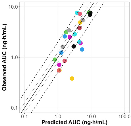 The scaled PBPK model from adults successfully predicted the pediatric PK profiles reported by Marier et al., 2004 [33], as illustrated in Figure S3. The pediatric PBPK model predicts AUC (0 to 12 h) reported by Jacqz-Aigrain et al., 1994 [30] for all the patients except for subject number 3 (Table 4). Furthermore, the PBPK model was verified using two other clinical studies [31,32] of pediatric patients after IV and oral dosing. The results are shown in Table S4. In approximately 75% of the simulations, PK parameters were within a 2-fold error of the respective observed values. The goodness-of-fit plots illustrate the alignment between the predicted versus observed AUC for the PBPK model in pediatrics, as summarized in Figure 3.