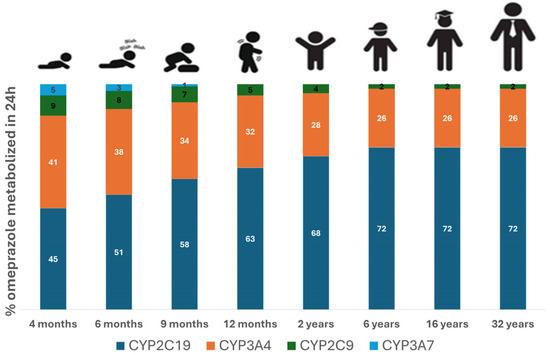 Percentage of omeprazole dose metabolized by different drug-metabolizing enzymes. Simulations were carried out using the developed PBPK model for different age groups, including 4 months, 6 months, 9 months, 1 year, 2 years, 6 years, 16 years, and 32 years of age following the administration of 10 mg omeprazole. To avoid a formulation confounding factor, all simulations were carried out using similar formulations across different age groups.