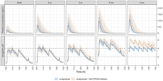 Simulated pharmacokinetic (PK) profiles with and without a hypothetical CYP3A full inhibition (upper panel) and the corresponding intragastric pH (lower panel) on day 8 following the administration of 20 mg omeprazole in adults and 0.7 mg/kg in pediatrics. The dotted line at pH 4 and the dashed line at pH 6 indicate thresholds for proton pump inhibitor treatment efficacy and safety, respectively. Data are expressed as medians (solid and dashed lines) and shaded areas represent the 5th–95th percentiles.