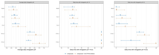 Simulated average intragastric pH and duration of pH > 4 and pH >6 over 24 h on day 8 following the administration of 20 mg omeprazole in adults and 0.7 mg/kg in pediatrics, without (blue solid line) and with (orange dashed line) a hypothetical CYP3A strong inhibition. Data are displayed as the median (●) with the 5th and 95th percentiles (—). The parameter values from omeprazole and omeprazole with full CYP3A inhibition were compared using the Kruskal–Wallis test with the Dunn’s Multiple Comparison post hoc test. Significance was set at a p value of less than 0.05. Groups that do not share a letter are significantly different.