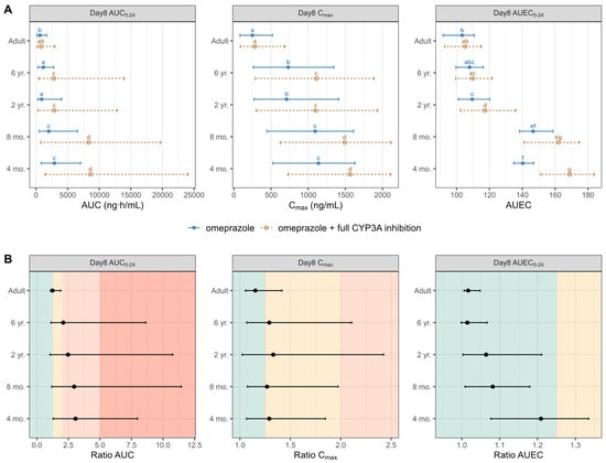 (Panel A) Simulated AUC, Cmax, and AUEC on day 8 following the administration of 20 mg omeprazole in adults and 0.7 mg/kg omeprazole pediatrics without (solid blue line) and with (dashed orange line) the DDI under a hypothetical full CYP3A inhibition. Data are displayed as the median (●) and the 5th and 95th percentiles (—). The parameter values from omeprazole and omeprazole with the full CYP3A inhibition of each group are compared by the Kruskal–Wallis test with the Dunn’s Multiple Comparison post hoc test. Significance was set at a p value of less than 0.05. (Panel B) Calculated DDI AUC, Cmax, and AUEC ratios on day 8 following the administration of 20 mg and 0.7 mg/kg of omeprazole, in adults and pediatrics, respectively, without and with the DDI under a hypothetical full CYP3A inhibition. Data are displayed as the median (●) and the 5th and 95th percentiles (—). The green area indicates no DDI interaction (ratio < 1.25), the yellow area indicates a weak DDI interaction (ratio range from 1.25 to 2), the orange area indicates a moderate DDI interaction (ratio range 2 to 5), while the dark orange area indicates a strong DDI interaction (ratio > 5). Groups that do not share a letter are significantly different.