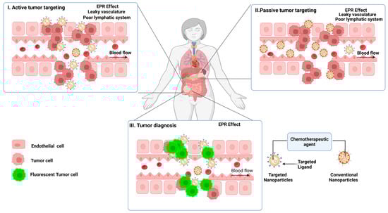 Tumor-targeting strategies using nanoparticles. This schematic illustrates three distinct approaches to tumor targeting using nanoparticles: (I) active tumor targeting, where nanoparticles are functionalized with ligands for specific tumor cell recognition; (II) passive tumor targeting, relying on the Enhanced Permeability and Retention (EPR) effect due to leaky vasculature and poor lymphatic drainage in tumor tissues; and (III) tumor diagnosis, utilizing fluorescent nanoparticles for imaging and detection. The figure highlights the key mechanisms involved in each strategy, including blood flow, nanoparticle accumulation, and tumor cell interactions.