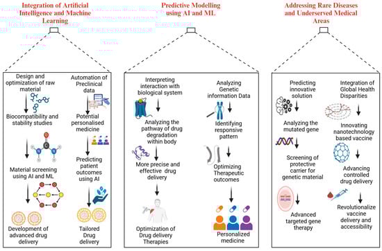 These advanced materials have already demonstrated their transformative potential in both clinical and preclinical settings when incorporated into drug delivery systems. Nanomaterials, hydrogels, and bio responsive polymers have introduced innovative approaches to drug delivery, paving the way for personalized and precision medicine. However, critical challenges, such as scalability, regulatory approval, and long-term biocompatibility, must be addressed to facilitate the smooth translation of these innovations from the laboratory to clinical application. Artificial intelligence and machine learning are expected to play a crucial role in material design and clinical outcome prediction (see below). Furthermore, ongoing research in biodegradable materials and environmentally friendly processing technologies will be essential for the sustainable development of advanced drug delivery systems. As these materials continue to evolve, they are set to provide new, innovative solutions to unmet medical needs, significantly enhancing patient care on a global scale.