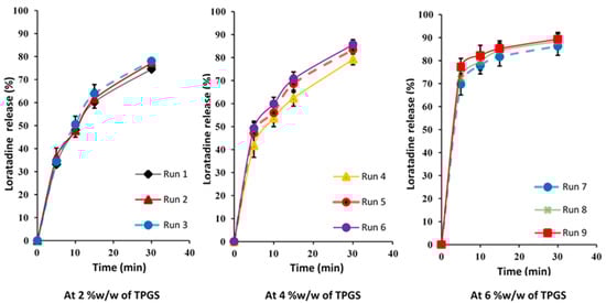 The ANOVA results presented in Table 7 demonstrate that both TPGS and SSG significantly influenced the dissolution behavior of the manufactured tablets, with p-values of <0.0001 and <0.0003, respectively. The positive coefficients in Equation (14) indicate that increasing the levels of both factors enhances the percentage of drug release at 30 min. Among these factors, TPGS had a more pronounced effect on dissolution, as evidenced by the higher sum of squares value (153.42 for TPGS compared to 53.34 for SSG). This indicates that TPGS is the dominant factor in improving the dissolution profile. As illustrated in Figure 3, the percent drug release at 30 min increased with the simultaneous increase in both TPGS and SSG levels. However, the influence of TPGS was more substantial, underscoring its critical role in enhancing the dissolution of poorly soluble LTD. The superior influence of TPGS on tablet dissolution can be attributed to its surfactant properties, which play a critical role in improving the solubility and release of poorly water-soluble drugs like LTD. The TPGS is a non-ionic surfactant with an HLB value of 13.2 and a low critical micelle concentration of 0.02% w/w, making it highly effective in reducing interfacial tension between the drug particles and the dissolution medium [35]. By lowering the interfacial tension, TPGS enhances the wetting of drug particles and facilitates the formation of micelles, which encapsulate the drug and improve its dispersion in the dissolution medium [36]. The amphiphilic nature of TPGS, characterized by its hydrophilic polar head and lipophilic alkyl tail, allows it to adsorb onto the surface of drug particles, creating localized areas with a high concentration of surfactants. This facilitates the solubilization of the poorly soluble LTD, thereby increasing its release into the bulk solution [36,37]. This mechanism aligns with the findings reported by Sotthivirat et al., who demonstrated that TPGS significantly improved the dissolution of hydrophobic drugs by enhancing their wetting, solubilization, and dispersion properties [4]. Furthermore, the ability of TPGS to form micelles at low concentrations promotes the incorporation of the drug within micellar structures, thereby increasing the surface area available for dissolution. Additionally, TPGS can inhibit drug recrystallization, maintaining the drug in an amorphous form, which further contributes to improved dissolution and absorption [36].