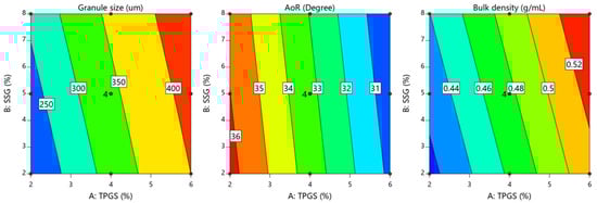 In this study, the contour plots in Figure 2 indicate that increasing the levels of TPGS led to a simultaneous increase in both the granule size and bulk density. This suggests that TPGS not only acted as a binder to promote granule formation, but also contributed to granule consolidation. The coalescence of powder particles facilitated by TPGS reduced the porosity of the granules, making them denser. The findings align with previous reports by Pandey et al. [31] and Sotthivirat et al. [11], who also observed that formulations containing TPGS showed larger granule sizes and higher bulk densities compared to conventional formulations. These studies confirmed that TPGS enhances both the size and compactness of granules, leading to improved flow properties and compressibility during tablet manufacturing. Therefore, the correlation between the granule size and bulk density observed in this study further validates the role of TPGS as an effective binder in the wet granulation process.