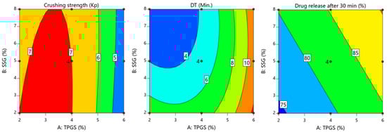 The ANOVA results in Table 7 revealed that the tablets’ crushing strength was significantly affected by TPGS (p < 0.0001 for TPGS and p = 0.267 for SSG). The negative regression coefficient for TPGS (−1.2) indicates that the increasing TPGS concentration led to a decrease in the crushing strength. This observation aligns with the contour plot in Figure 3, which shows a reduction in the crushing strength at higher TPGS levels.