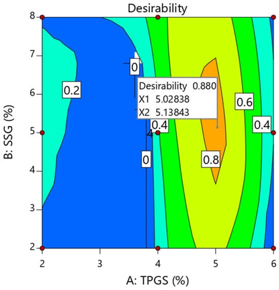 The ANOVA analysis shown in Table 6 demonstrated that the level of TPGS and SSG had a significant effect on the bulk density of the prepared granules (p < 0.0001 for TPGS and p = 0.05 for SSG). Equation (10) demonstrates that an increase in the concentration of TPGS and SSG led to a greater increase in the bulk density of the produced granules, as shown by the positive sign of the coefficient estimates (+0.0495 for TPGS and +0.013 for SSG). Furthermore, Figure 2 highlights the pronounced effect of TPGS on the granules’ bulk density in a positive direction. This observation suggests that higher levels of TPGS promote granule consolidation, resulting in denser granules. This finding is consistent with the report by Sotthivirat et al., which also noted that the presence of TPGS enhances the granule compactness and density [11].