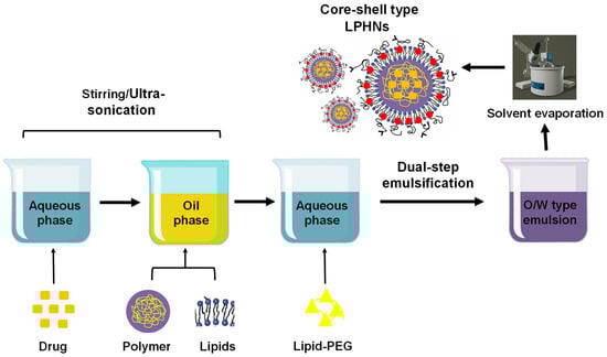 In this method, the polymer and drug to be encapsulated are dissolved in the organic (oil) phase. Using ultrasonic stirring, the solution is then gradually added to a lipid-water dispersion medium, forming an oil-in-water (o/w) emulsion. A rotary evaporator is employed to evaporate the organic solvent under reduced pressure, resulting in the formation of a polymer core, while the lipid-PEG conjugates self-assemble around the core (Figure 4). This technique is preferred over nanoprecipitation for the formulation of various LPHNs due to its ability to form stable emulsions. It is commonly used in the preparation of LPHNs loaded with nucleic acids for cancer treatment [18,66].