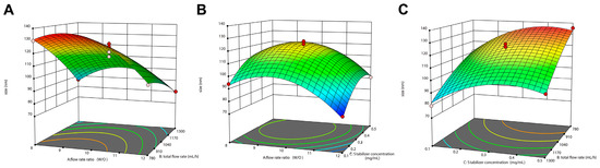 Three-dimensional surface for two-factor interactive effect. (A) Interaction of flow rate ratio (W/O) and total flow rate. (B) Interaction of flow rate ratio (W/O) and stabilizer concentration. (C) Interaction of total flow rate and stabilizer concentration.