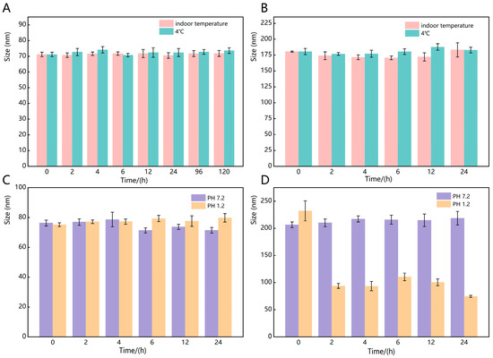 Stability of CPC-NPs (A) and CUR-NPs (B) stored at room temperature and 4 °C; CPC-NPs (C) and CUR-NPs (D) stored at PH 1.2 and 7.2.