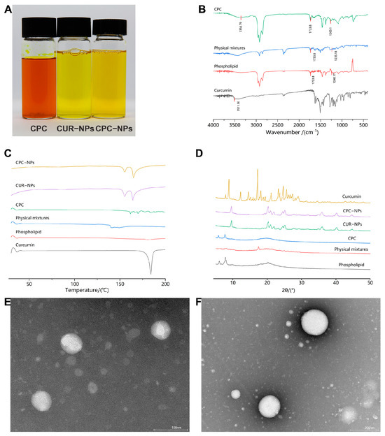 Visualization and characterization of different preparations. (A) Visual images of CPC, CUR-NPs, and CPC-NPs. (B) FT-IR spectrum of curcumin, phospholipid, physical mixture of curcumin and phospholipid, and CPC. (C) DSC thermograms of curcumin, phospholipid, physical mixture of curcumin and phospholipid, CPC, CUR-NPs, and CPC-NPs. (D) XRD patterns of curcumin, phospholipid, physical mixture of curcumin and phospholipid, CPC, CUR-NPs, and CPC-NPs. (E) TEM results for CPC-NPs. (F) TEM results for CUR-NPs.