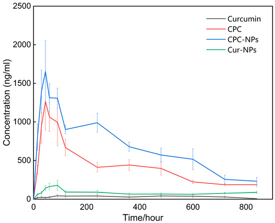 Twenty-four rats were randomly divided into four groups (N = 6) [45,46]. Curcumin (control), CPC, CPC-NPs, and CUR-NPs were administered orally at a dose of 200 mg/kg (based on the content of curcumin). Blood samples were collected at 15, 30, 45, 60, 120, 240, 360, 480, 600, 720, and 840 min after oral administration and stored in EDTA-treated anticoagulated centrifuge tubes. Plasma samples were centrifuged at 4 °C for 10 min at 3000 r/min, and the supernatant was stored at −80 °C in a refrigerator until analysis.