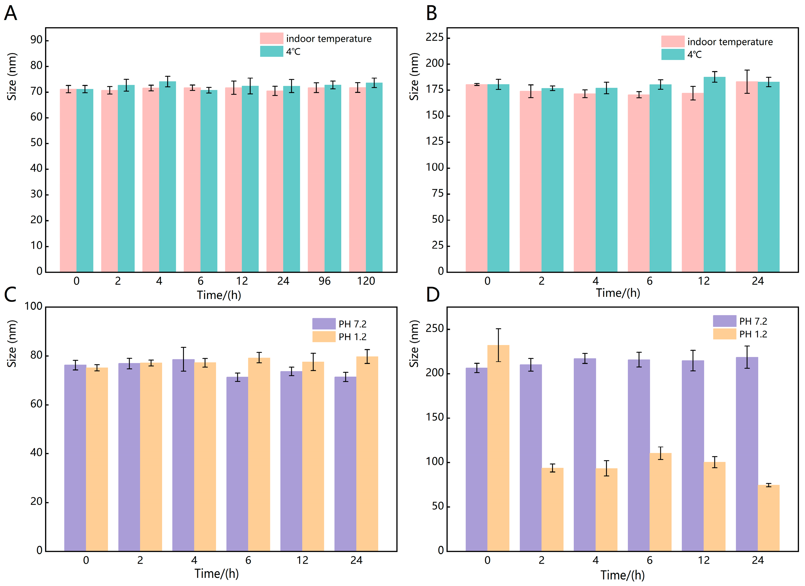The prepared CPC-NPs and CUR-NPs were divided into two aliquots; one was stored at room temperature, and the other was stored in a refrigerator at 4 °C; the Dh and PDI of the two samples were determined at 0, 4, 8, 24, 48, 72, and 96 h during the stability testing, respectively. In addition, the stability of CPC-NPs and CUR-NPs under physiological conditions was determined, i.e., CPC-NPs and CUR-NPs were dispersed in phosphate buffer solutions at pH 1.2 and pH 7.2, and their Dh and PDI were measured at 0, 2, 4, 6, and 12 h.