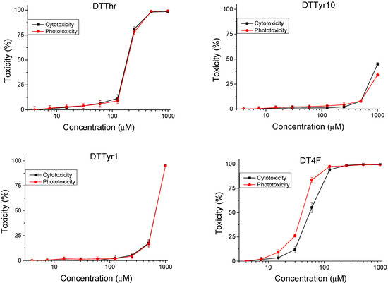 The modification of the parent peptide F1LPLIGRVLS10GIL-NH2 (DTA) at positions 1 or 10 with Tyr (DTTyr10, DTTyr1) resulted in a significant reduction in the toxicity—six and more than ten times, respectively. Thus, the assumption could be made that an aromatic ring together with a phenol type hydroxyl function is preferable for lower toxicity than aliphatic (Ser10) or a lack of OH group (Phe1) in the parent DTA molecule. In contrast, the incorporation of fluorine in the primary structure of the peptide by the substitution of proteinogenic Phe in position 1 with fluorinated Phe(4-F) (DT4F) resulted in a two-fold increase in the cytotoxicity compared to the parent peptide (Figure 2 and Table 2). However, none of the newly designed Temporin A analogues exhibited phototoxicity.