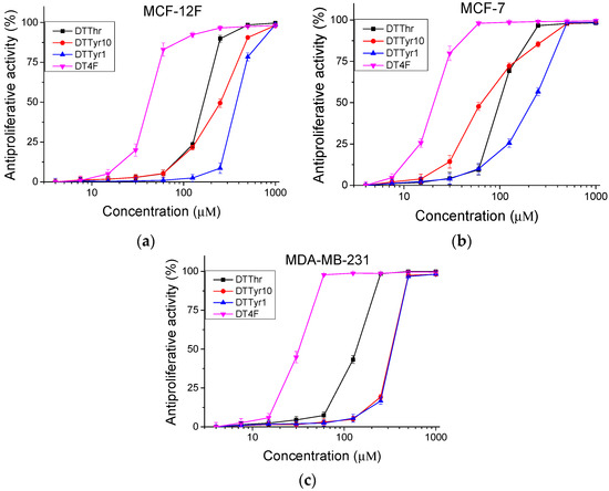 The peptide analogues were studied for antiproliferative activity with an MTT assay. Cells were incubated with the tested peptides for 72 h. The obtained results are shown in Figure 3. The mean IC50 values and selectivity index were calculated and are presented in Table 3. In the MCF-12F cell line, the highest antiproliferative effect was observed for peptides DTThr (IC50 = 165.09 ± 2.21 µM) and DT4F (IC50 = 41.78 ±1.64 µM). Similar results were obtained for the MDA-MB-231 cell line. In contrast, for the MCF-7 cell line, a significantly higher (p < 0.001) antiproliferative activity of the investigated peptide analogues was detected. In MCF-7 cells, the peptides DTTyr10 and DT4F were the most active, with IC50 = 64.51 ± 3.93 µM and 20.33 ± 0.6 µM, respectively. The same peptides also exhibited the highest selectivity towards MCF-7 cells (SI = 3.9 and 2.06, respectively).