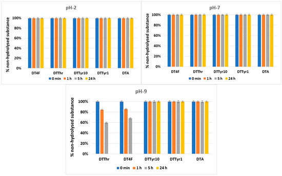 Most of the newly synthesized peptides were stable in the model systems used for hydrolytic stability investigation, except for DTThr and DT4F in pH 9.0. The dynamics of the hydrolysis during the 24-h period are presented in Figure 4.