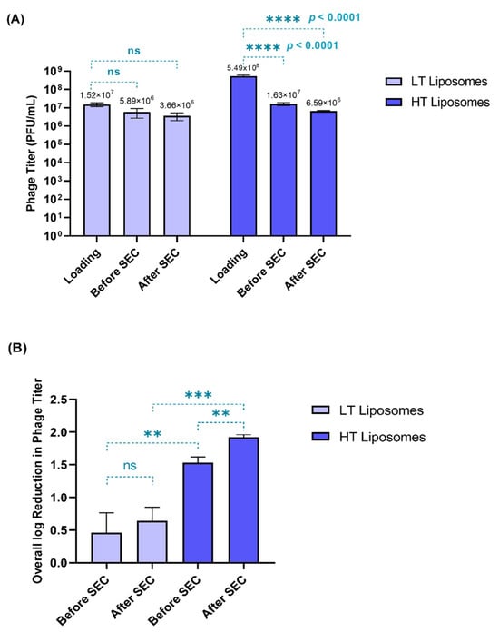 Two phage loading titers were tested during hydration—1.98 × 107 and 5.49 × 108 PFU/mL—yielding low-titer (LT) and high-titer (HT) liposomes, respectively. Phages can lose their viability due to processing conditions such as hydration temperature and shear stress on extrusion [31]. Therefore, phage viability was tested at different stages in the preparation of liposomes (Figure 1A)—before the separation of free phages (before SEC) and after the separation of free phages (after SEC). Figure 1B compares the overall log reduction during the preparation of LT and HT liposomes.