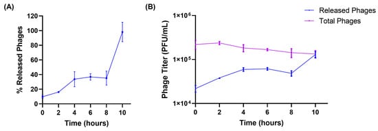 (A) Release patterns of phages from liposomes in simulated lung fluid at 37 °C. (B) Phage titer of released phages and total viable (encapsulated + released) phages present at different time points (hours) in the release study. Each data point represents mean ± SD, (n = 3).