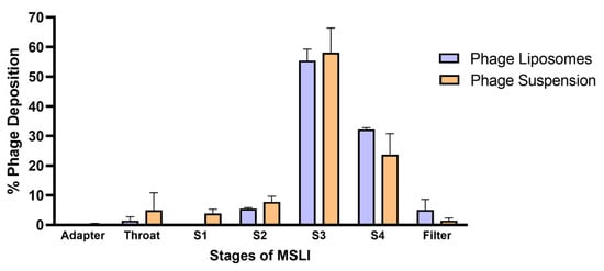 An important aspect when developing inhalable phage liposomes was to understand the effect of nebulization on (1) phage viability and (2) deposition of phages in the lungs. The effect on phage viability was assessed by comparing the phage titer before aerosolization and the phages recovered after nebulization. Table 2 summarizes the effect of nebulization on the phage titer of the phage suspension/liposomes. It was observed that the phage suspensions showed a significantly (*** p < 0.001) higher loss in phage titer (1.55 ± 0.04 log loss) upon nebulization compared to the liposomes (1.08 ± 0.05 log loss). The in vitro phage deposition was studied using MSLI, and the deposition profile (Figure 3) was obtained by determining the percentage of aerosolized phages deposited at different stages. The fine particle fraction (FPF) refers to the phage aerosols with an aerodynamic diameter of less than 5 µm. FPF accounts for the percentage of phages deposited at stage 4 and filter. Therefore, the FPF of the phage liposomes was 37.32 ± 2.94%, while that of the phage suspension was 25.09 ± 8.01%. No significant differences were observed in FPF between phage suspension and liposomes.