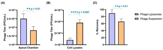 The phage cellular uptake was evaluated in a human lung epithelial cell model (H441 cell monolayer) grown at the air–liquid interface. The TEER value of the cell monolayer was found to be 270 ± 10 Ω.cm2, which was consistent with previous literature [28]. Phages (suspension/liposomes) with a titer 2.8 × 106 PFU/mL were incubated with the cell monolayer for four hours. After four-hour incubation, phage liposomes exhibited greater retention (2.59 ± 0.30 × 106 PFU/mL) outside the cells in the apical chamber than the free phages (2.10 ± 0.30 × 106 PFU/mL) (Figure 4A). Consequently, the titer in cell lysates of the phage liposomes (1.42 ± 0.16 × 104 PFU/mL) was significantly (p < 0.0001) lower than the free phages (2.91 ± 0.28 × 104 PFU/mL). This suggests that encapsulation of phages in liposomes can reduce the phage cellular uptake by two-fold (Figure 4B). This trend also holds true for the phage titer per µg cell lysate protein being significantly lower (p < 0.05) for the phage liposomes (31.68 ± 5.56 PFU) than the free phages (46.26 ± 4.46 PFU). It is interesting to note that the phage recovery (Figure 4C) at the end of the experiment was higher in the phage liposomes (89.39 ± 9.88%) than in the phage suspensions (65.91 ± 7.80%). This indicates that encapsulation in liposomes protects phages from inactivation in this in vitro study environment. No phages were detected in the basal chamber, or the titer may have been below the limit of detection (less than 100 PFU/mL).