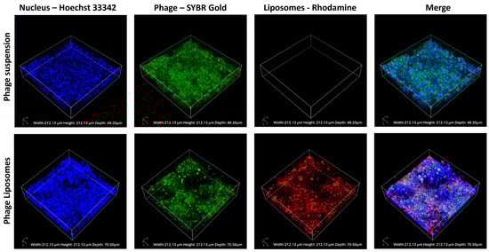 For imaging studies, the H441 cell monolayer was treated with SYBR-Gold labeled phages or labeled liposomes containing encapsulated SYBR-Gold phages. After a 4-h incubation, treatments were removed, and cells were washed. For nucleus staining, cells were stained with Hoechst 33342. The cell monolayer was cut, placed on a glass slide, and covered with an antifade mounting reagent and coverslip. The cell monolayer was imaged using a Nikon-A1Rsi confocal microscope (Nikon America Inc., Melville, NY, USA) with a 60× oil immersion lens. The 3D image was generated by using the Z-stack function to analyse the phage distribution across the entire cell monolayer. Captured images were viewed using Nikon NIS Elements software (version 5.21.00) [30].