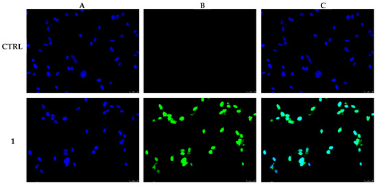 MDA-MB-231 cells were exposed to 0.3 µM of compound 1 or vehicle (CTRL) for 24 h. After processing, cells were observed, and images were taken at 20× magnification by means of an inverted fluorescence microscope. The green fluorescence, visible only for compound 1-treated cells, indicates nuclear DNA damage. Panels (A): DAPI (CTRL and 1) excitation/emission wavelength 350 nm/460 nm. Panels (B): CF™488A (CTRL and 1) excitation/emission wavelength 490 nm/515 nm. Panels (C): panels (A) and (B) overlay. Images are representative of three separate experiments.