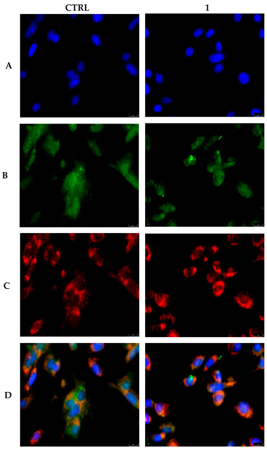 MDA-MB-231 cells were treated with 0.3 µM of 1 or vehicle (CTRL) for 24 h, then processed as described in the experimental section and observed at 40× magnification using an inverted fluorescence microscope. Compound 1 treatment induced Bid (green fluorescence, panel (B), 1) translocation into mitochondria (red fluorescence, panel (C), 1), as noticeable in the merge channel (panel (D), 1). Nucleus staining is also shown (panels (A)). Panels (A): DAPI, excitation/emission wavelength 350 nm/460 nm. Panels (B): Alexa Fluor® 488, excitation/emission wavelength 490 nm/515 nm. Panel (C): MitoTracker Deep Red FM probe, excitation/emission wavelength 644/665 nm. Panels (D): panels (A) and (B) overlay. Representative fields of three different experiments are shown.