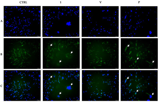 Immunostaining studies on MDA-MB-231 cells treated with compound 1 (0.3 µM), Vinblastine, Paclitaxel (both at 1 µM), or vehicle (CTRL, DMSO) for 24 h. In the control experiment (CTRL), cells exhibited a regular arrangement of cytoskeleton. Vinblastine and Paclitaxel, instead, dramatically impacted the tubulin network. Vinblastine produced tubulin crystal formation (panel (B), V), whereas Paclitaxel induced tubulin bundles and thickened fibers (panel (B), P). Compound 1 exposure produced a morphology similar to Paclitaxel treatment (white arrows). Panels (A): DAPI, excitation/emission wavelength 350 nm/460 nm. Panels (B): β-tubulin (Alexa Fluor® 488) excitation/emission wavelength 490 nm/515 nm. Panels (C): overlay. Images were taken at 20×, and representative fields were shown.