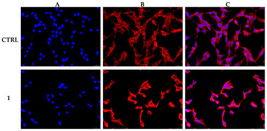 Actin immunofluorescence studies were conducted on MDA-MB-231 cells treated with 1 (0.3 µM) or vehicle (CTRL, DMSO) for 24 h. Cells were processed as detailed in the Section 2. Control cells (CTRL) showed a normal actin cytoskeleton organization, whereas under 1 exposure, the actin network appeared irregularly arranged and packed into the cell cytoplasm. Panels (A): nuclear DAPI staining (λex/λem = 350/460 nm); Panels (B): β-actin (Alexa Fluor® 568; λex/λem = 644/665 nm); Panels (C): overlay. Images were taken at 20× and show representative fields.