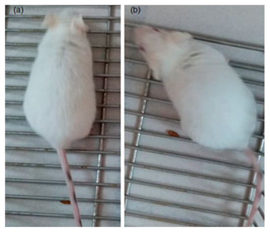 Representative photos of mice behaviors: (a) healthy and normal behaviors were registered for negative control (NC) and (b) the compound 1 group.