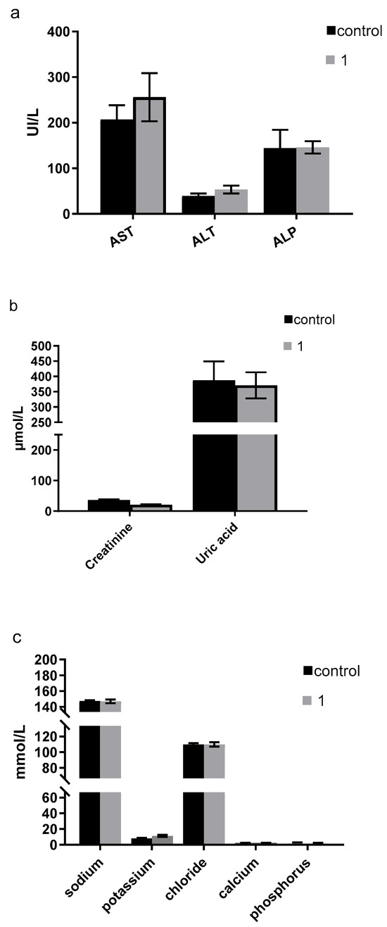Biochemical analyses of the serum from groups of mice untreated or treated with compound 1; (a) aspartate aminotransferase (AST), alanine aminotransferase (ALT), and alkaline phosphatase (ALP); (b) creatinine and uric acid; and (c) sodium, potassium, chloride, calcium, and phosphorus serum levels were measured in the two groups of mice (control and compound 1-treated) and after 1 week.