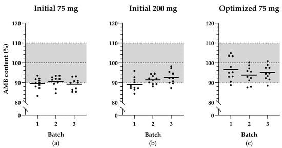 Scatter plots illustrating ambroxol hydrochloride (AMB) content distribution of the selected capsule samples across validation batches: (a) initial capsules of 75 mg AMB; (b) initial capsules of 200 mg AMB; (c) optimized capsules of 75 mg AMB. The black lines indicate the mean of the AMB content per batch, the horizontal dashed line represents the target content for the produced capsules, and the dashed-and-dotted lines together with the grey area represent the acceptable range for mean capsule content.