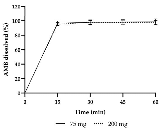 Interestingly, during dissolution testing, the average AMB content determined by UV-VIS was higher (75 mg and 200 mg together: 97.8 ± 1.8%) than the average AMB content measured by the HPLC-UV (75 mg and 200 mg together: 90.4 ± 1.4%).