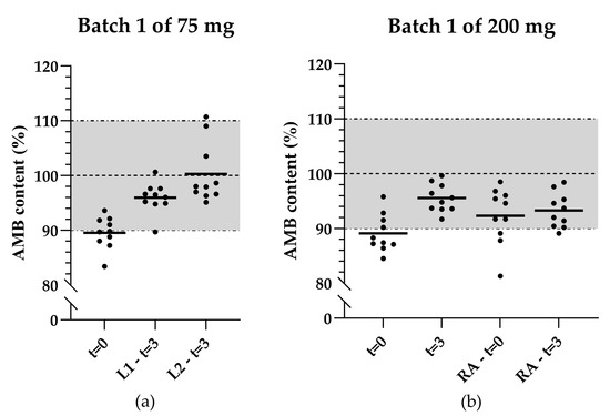 Scatter plots illustrating the content distribution of the initial product validation and after 3 months of storage of (a) 75 mg AMB capsules in the same bottle analyzed by two laboratory technicians; (b) 200 mg AMB capsules reanalyzed by another laboratory technician. The black lines indicate the mean of 10 capsules, the horizontal dashed line represents the target concentration, and the dashed-and-dotted lines together with the grey area represent the acceptable range for mean capsule content. t = 0: Analysis during the initial product validation. t = 3: Analysis after 3 months of storage. L1: Laboratory technician 1. L2: Laboratory technician 2.