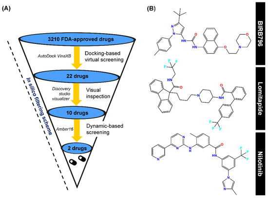 (A) In silico filtering scheme, which includes first-round docking-based screening, visual inspection, and SIE-based dynamic screening as well as the program used during each step. (B) Chemical structures of a well-known p38α MAPK allosteric inhibitor (BIRB796), Lomitapide, and Nilotinib, obtained via this computational platform.