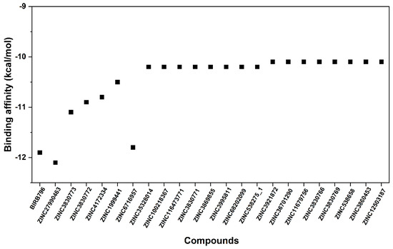 Binding affinity in kcal/mol of selected first-round screened compounds that were successfully docked into the focused allosteric site of p38α MAPK compared to BIRB796. Note that the prediction was based upon the scoring function implemented in the Autodock VinaXB, Sirimulla Research Group at the University of Texas at El Paso, TX, USA.