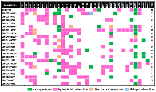 Map of intermolecular interactions of BIRB796 and all 22 screened compounds as well as total features sharing interactions with BIRB796. Each type of noncovalent interaction was also illustrated in different colors. It is worth noting that these occurred interactions were based upon the best docked conformation and visualized by Accelrys Discovery Studio 2.5. * The compounds selected to run MD simulations.
