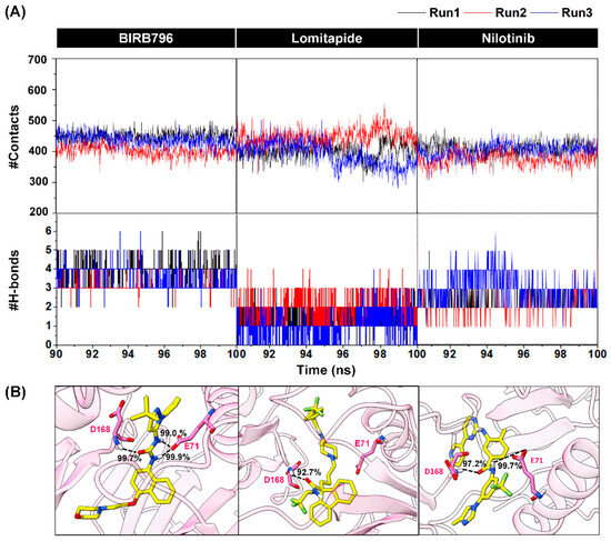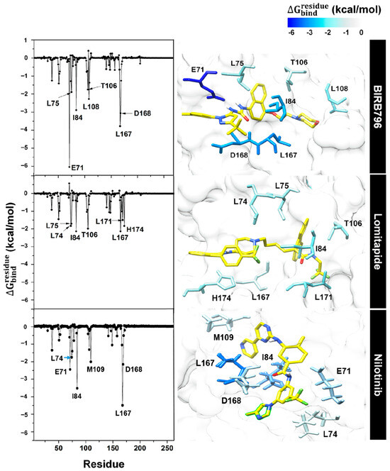 The sentence “Lomitapide and nilotinib showed a slightly higher ΔGRF (17.01 ± 0.24 and 17.15 ± 0.17, respectively) than BIRB796 (15.60 ± 0.20), implying the relatively minute higher polar solvation in the lomitapide and nilotinib complex system” was added in Chapter 3.2, Page 8, Line 267–269.