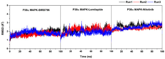 Plot of root-mean-square displacement (RMSD) for the protein-ligand complexes. The data were illustrated in three independent runs with different initial velocities.