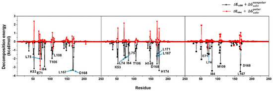 Analysis of per-residue VdW and electrostatic decomposition energy in which the amino acids largely contributed via VdW and electrostatic interaction energies were labelled as a one-letter code format. We noted that even though some residues (e.g., K53, H148) were noticeably stabilized through vdW interactions, they did not play a role in the binding process since they were destabilized by electrostatic charge-charge repulsion (as observed in a positive electrostatic energy). Hence, these kinds of residues were not shown in the article Figure 6.