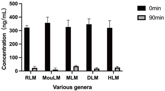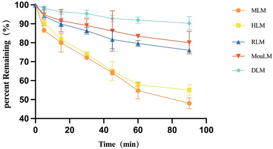 The results indicate that after 90 min of incubation, testosterone was metabolized in the liver microsomes of Sprague-Dawley rats (RLM), KM mice (MouLM), beagle dogs (DLM), crab-eating macaques (MLM), and humans (HLM). These findings confirm the normal activity of liver microsomes across the five species, facilitating subsequent metabolic studies of TPB15. The metabolic data for testosterone in liver microsomes from various species are shown in Table S2 in Supplementary, with the remaining concentration graph represented in Figure 2.