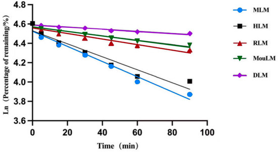 Figure 4. Linear regression plots (RLM: Sprague-Dawley rat microsomes, MouLM: KM mice microsomes, DLM: beagle dog microsome, MLM: crab-eating monkey microsomes, HLM: human microsomes).
