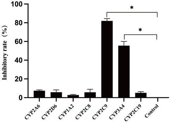 The effects of various selective CYP450 enzyme inhibitors on TPB15 metabolism in human liver microsomes are detailed in Figure 5 and Table 6. Compared to the positive control group, the inhibitors sulfamethoxazole and ketoconazole significantly inhibited TPB15 metabolism (p < 0.05), with inhibition rates of 81.22% and 50.25%, respectively. Other inhibitors did not significantly impact TPB15 metabolic enzyme activity (p > 0.05), indicating that CYP2C9 and CYP3A4 are the primary metabolic enzymes involved in TPB15 metabolism in human liver microsomes.