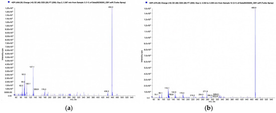 Figure 6. Human liver microsome incubated for 90 min: (a) TPB15 mass spectrum; (b) mass spectrum of metabolites.